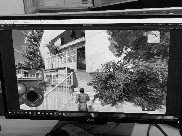 將之前導(dǎo)出的模型和音頻等素材導(dǎo)入至unity3D的Assets文件夾下,通過C#編寫腳本實(shí)現(xiàn)主要功能,包括:用戶可通過鍵盤或者搖桿控制虛擬人物視角和移動(dòng)、通過設(shè)置代理系統(tǒng)可實(shí)現(xiàn)自動(dòng)導(dǎo)航漫游、通過設(shè)置碰撞器實(shí)現(xiàn)進(jìn)入指定區(qū)域后進(jìn)行特定音頻播放和語音講解、結(jié)合EasyAR實(shí)現(xiàn)AR小精靈等交互功能,通過增加一個(gè)頂視圖攝影機(jī)實(shí)現(xiàn)小地圖功能。圖3為以第三人稱視角進(jìn)行虛擬漫游。