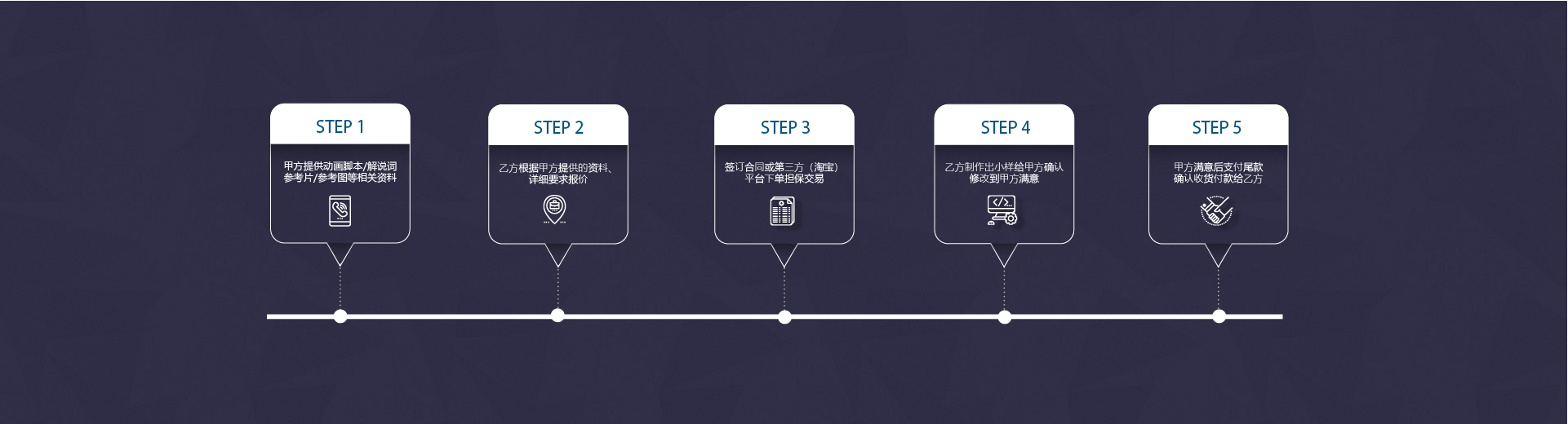提供資料報(bào)價(jià)-簽訂合同|淘寶下單-細(xì)節(jié)溝通-開(kāi)始制作-提交預(yù)覽-細(xì)節(jié)修改-滿(mǎn)意后付尾款交成片