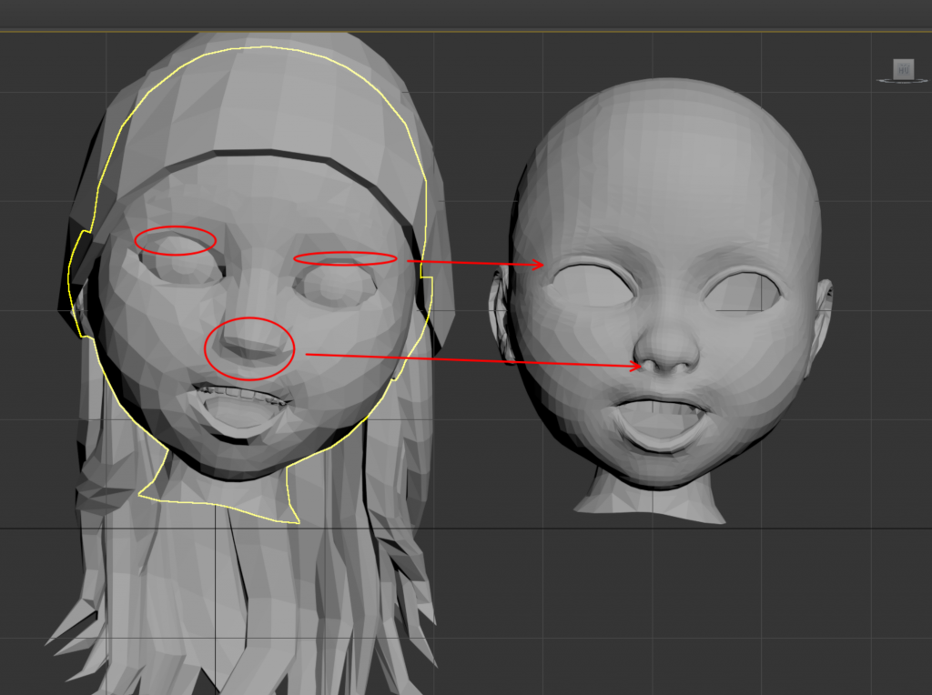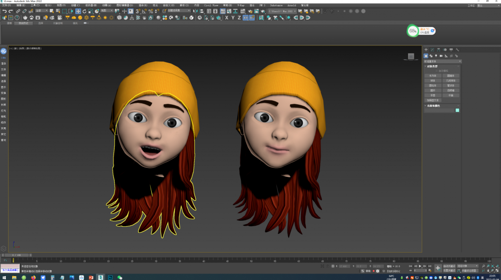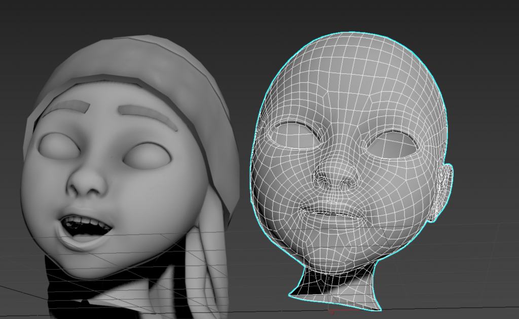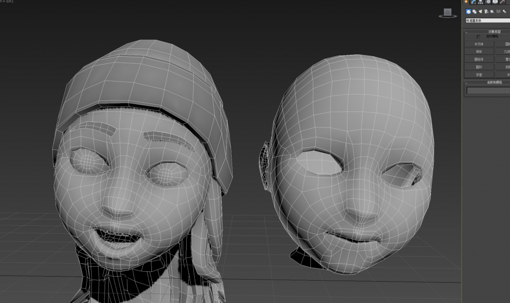制作軟件:未平滑的頭模,脖子24條邊。脖子一級平滑后保持在24條邊,客戶在max中接上身體,頭發(fā)用素材示意一下就好,表情動作正常建一個,然后在正常的基礎(chǔ)上拉開嘴巴。